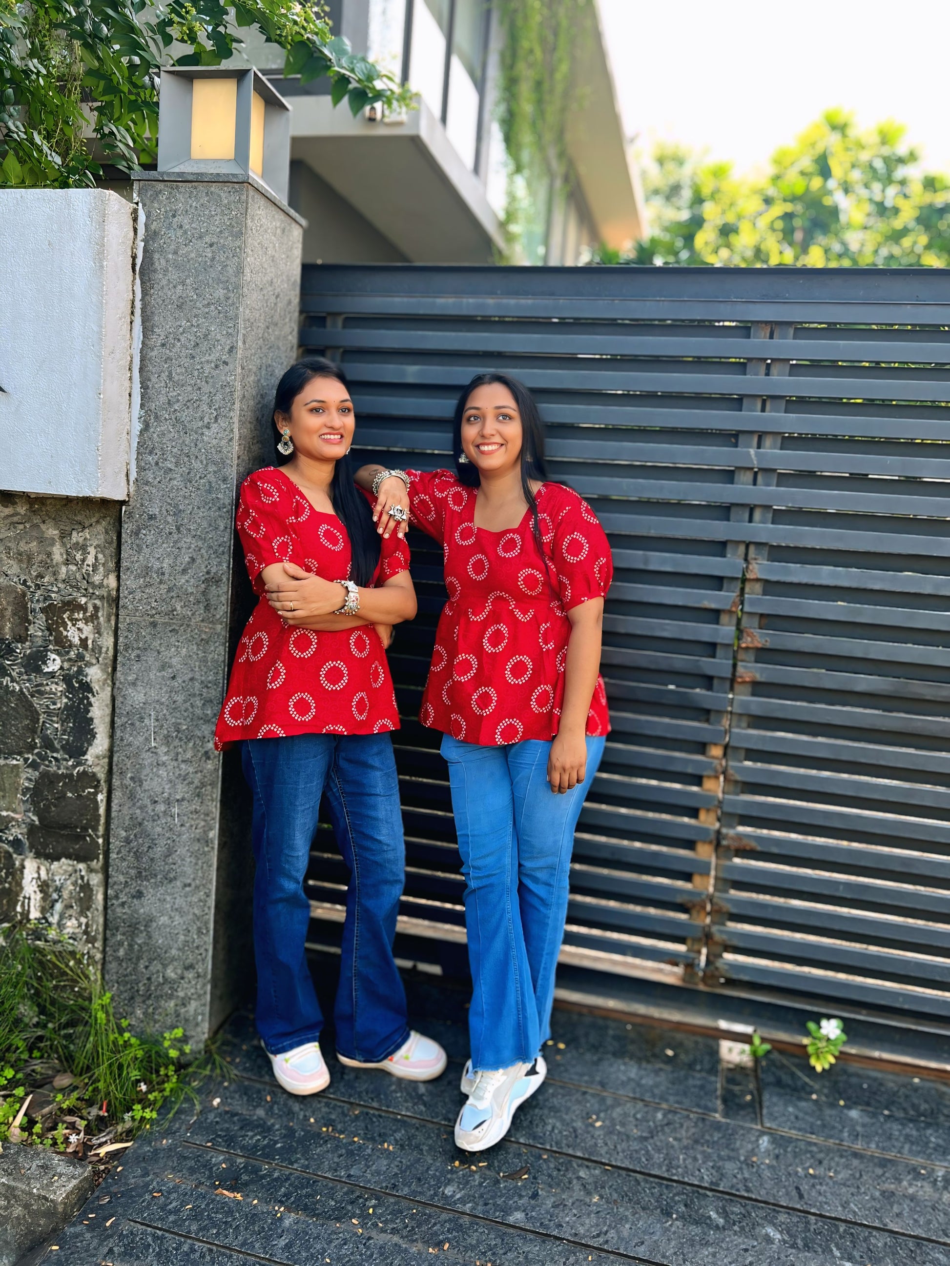 Crafted from a soft, breathable cotton, this top features a striking Bandhani-inspired print in a bold, deep red base color. The intricate white circular patterns give it an authentic, handcrafted feel. The top cinches gently at the waist, then flares out into a playful peplum hem that adds movement and structure. It's the perfect cut to pair with high-waisted bottoms. It features a stylish square neckline that beautifully frames the collarbones, offering a classic yet contemporary appeal. The short puffed sleeves add a touch of romantic drama and volume, balancing the fitted waist perfectly. The top features a subtle tie-back detail that allows you to adjust the fit for a custom.